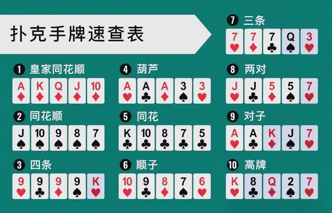 2025年12月28日Published by dxjj on 2025年12月28日Categories 扑克新闻德州扑克牌型全解析,含皇家同花顺及平局规则,关乎成牌概率01牌型简介与速查无论你是扑克新手还是老手,拥有扑克手牌速查表对于新手和老手同样重要,可以方便地下载或打印以便随时查阅。皇家同花顺由10至A组成的顺子